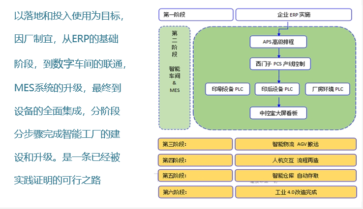 以落地和投入使用为目标,因厂制宜,从ERP的基础阶段,到数字车间的联通,MES系统的升级,最终到设备的全面集成,分阶段分步骤完成智能工厂的建设和升级。是一条已经被实践证明的可行之路。