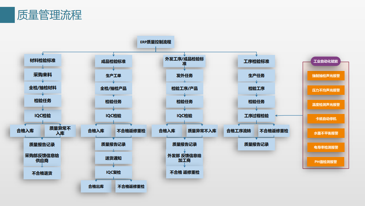 从原材料到成品完成,全过程实现自动化监控,故障自动报警诊断,所有数据同步传给ERP,方便系统决策