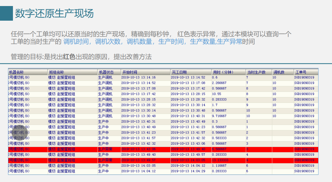以设备稼动率报表为例,任何一个工单,均可以还原当时的生产现场,精确到每秒钟,可以查询这个工单当时生产的调机时间、调机次数、调机数量、生产时间、生产数量、生产异常等,为企业实现精益生产提供准确而及时的数据。